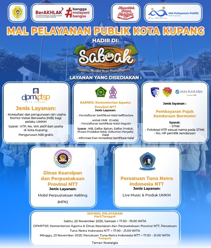 Pelayanan ini menyatu dengan suasana Sunday Market Buat Orang Kupang (Saboak), sehingga warga yang sedang menikmati akhir pekan tetap dapat mengurus berbagai kebutuhan administrasi pemerintahan tanpa harus menunggu hari kerja.